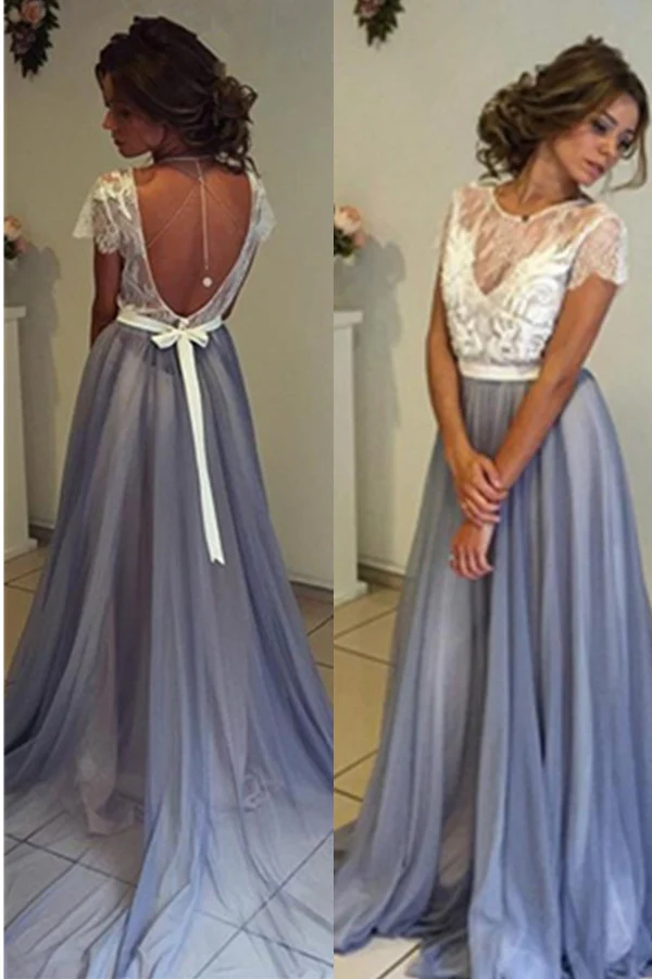 A-line Long Blue Open Back Lace Tulle Simple Cheap Beautiful Prom Dress K658