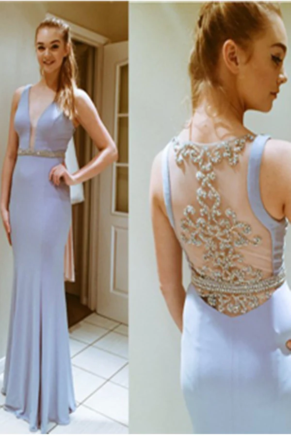 Mermaid Lavender Long Close Back Beading V-neck Prom Dress K633