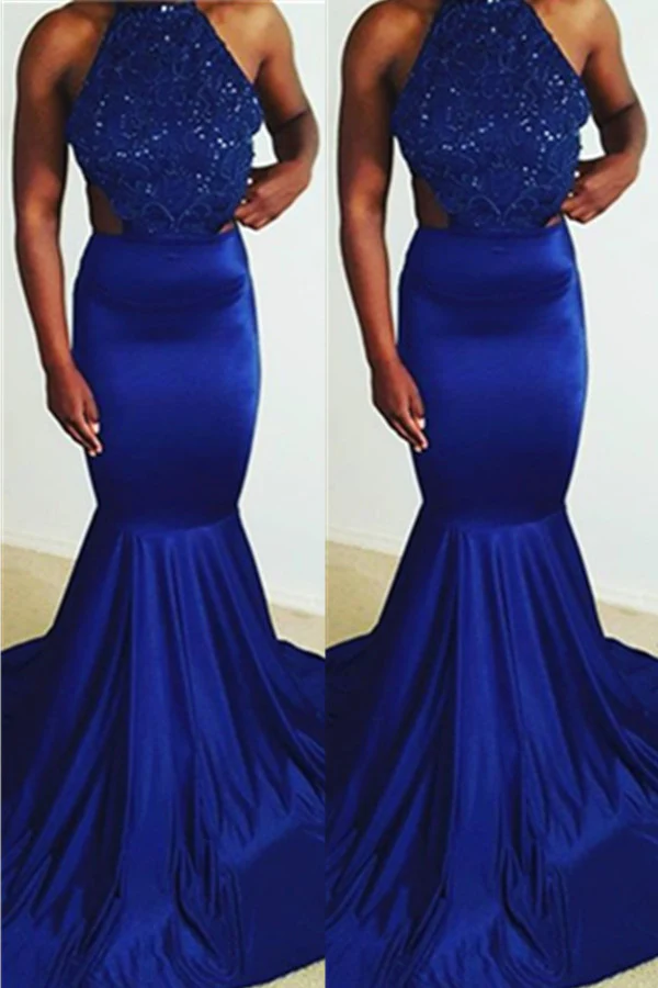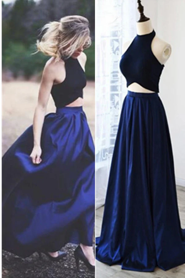 Two Pieces Royal Blue A-line Long Simple Halter Open Back Prom Dress K663