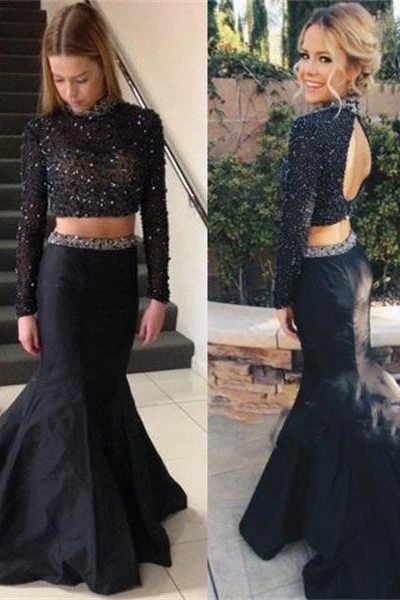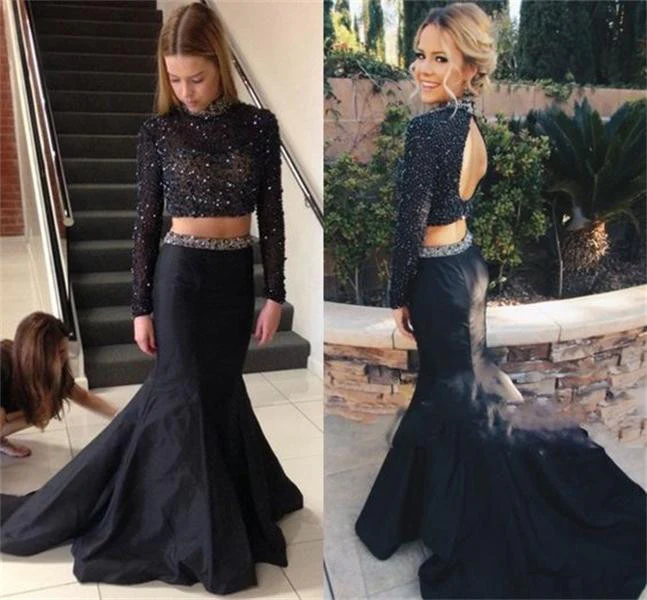 Black Beaded Long Sleeves Two Pieces Mermaid Backless Prom Dress K678