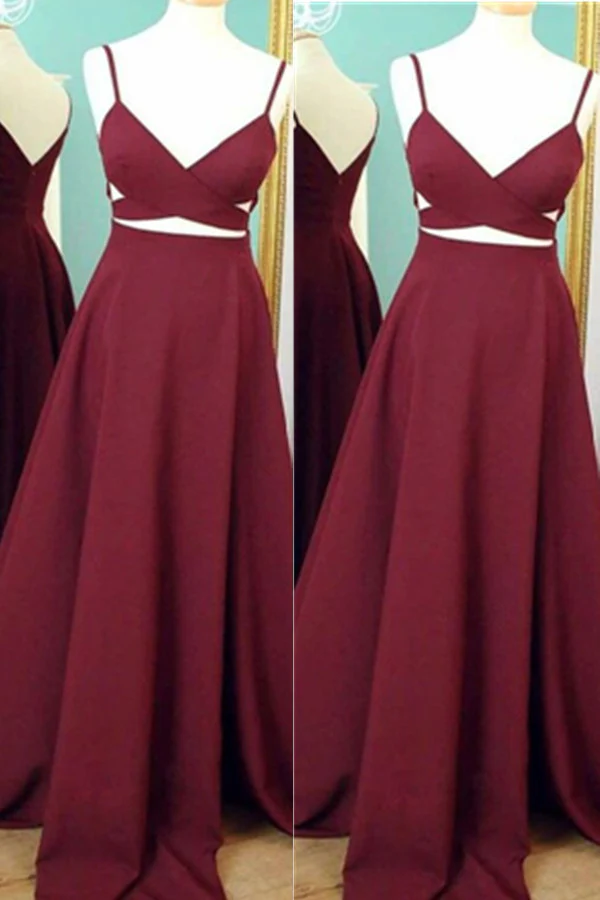 Two Pieces Burgundy Long A-line Satin Beaded Pretty Prom Dress K695