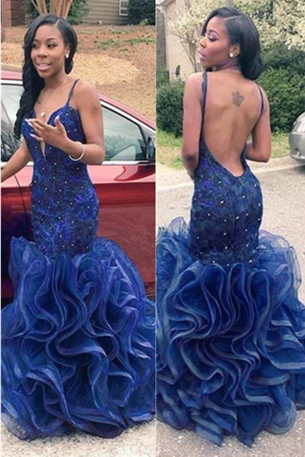Gorgeous Blue Mermaid Long Open Back Spaghetti Straps Beading Prom Dress K656