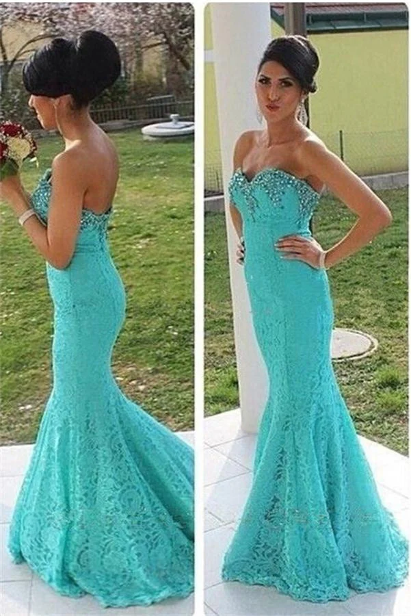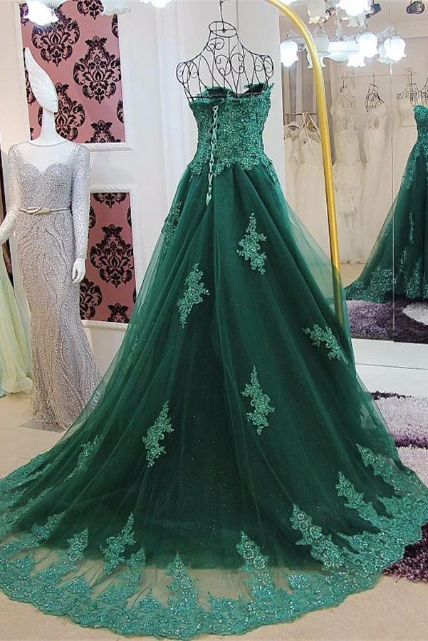 Sweetheart Lace Beading Long Green A-line Modest Prom Dress K701