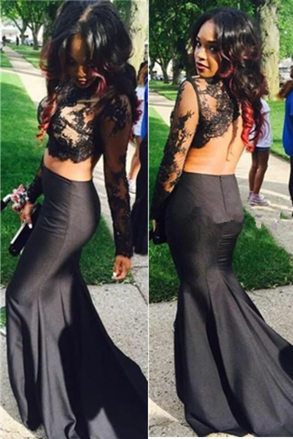 Long Sleeves Backless Lace Satin Black Mermaid 2 Pieces Prom Dress K669