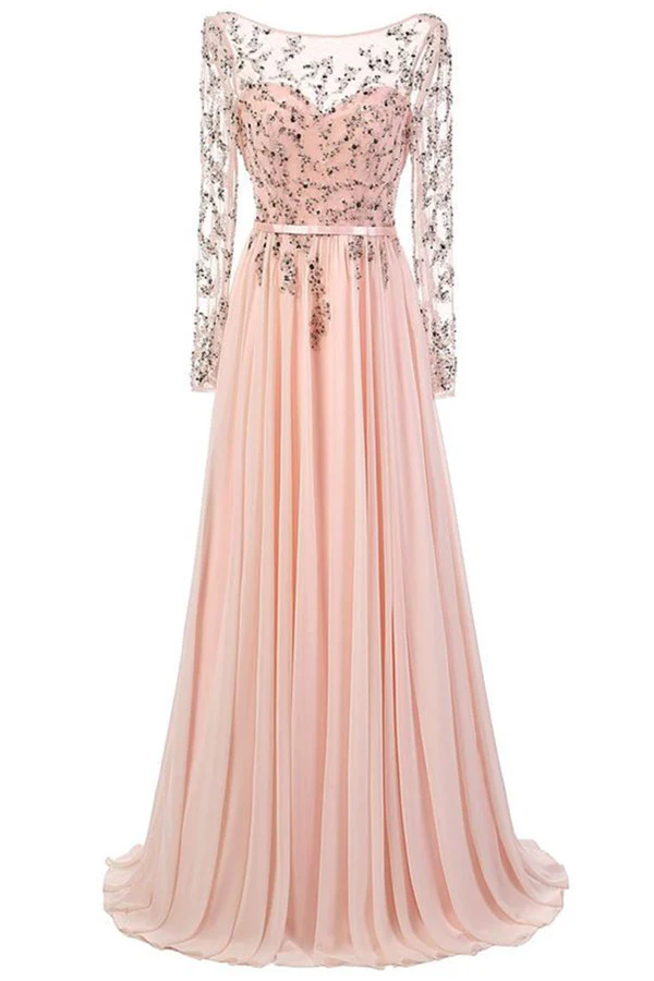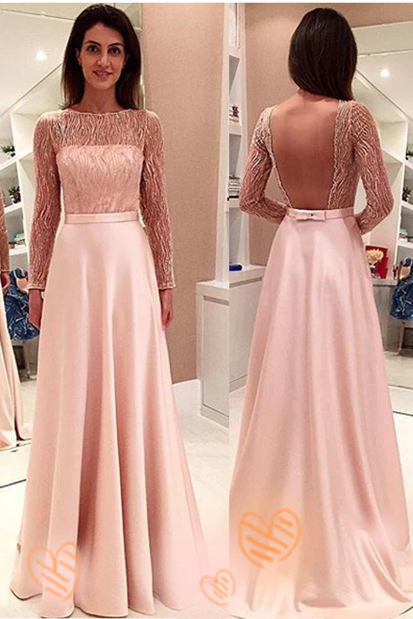 Long Sleeves Lace Pink Chiffon A-line Beading Open Back Prom Dress K692