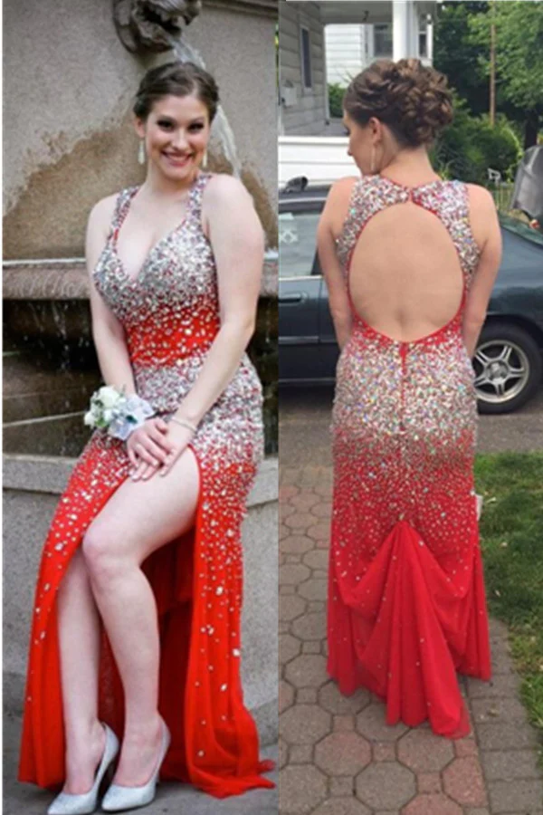 Sparkly Sexy Red Beaded Open Back V-neck Plus Size Prom Dress K631