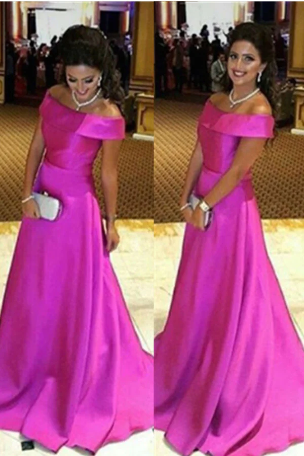 Hot Pink Off Shoulder Formal High Low Simple Satin Long Prom Dress K667