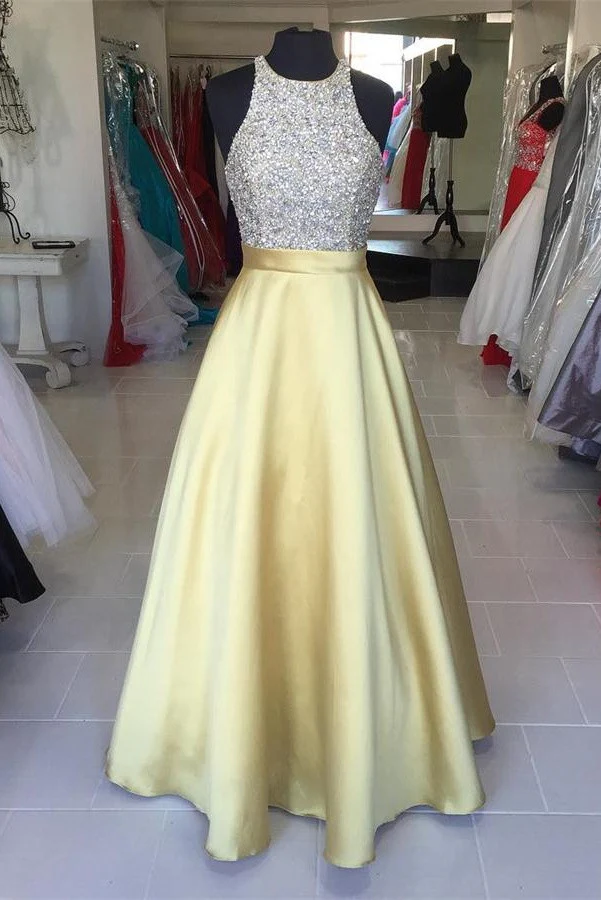 Yellow Satin Long Halter Beading Simple Cheap Prom Dress K697