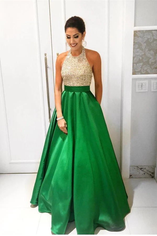 Green A-line Beading Halter Simple Handmade Cheap Backless Prom Dress K675