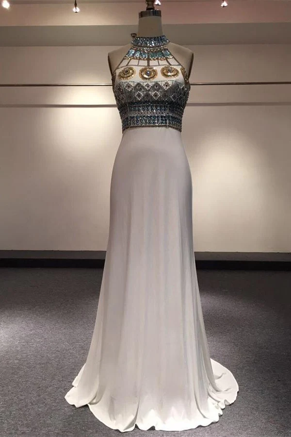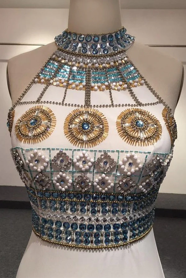 White Halter Beaded Two Pieces Long Mermaid Prom Dress K714