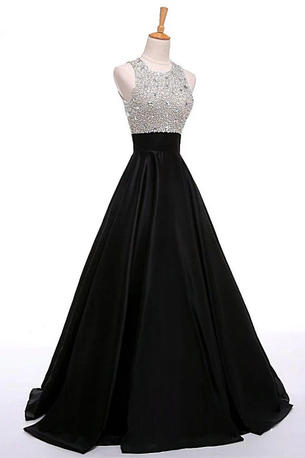 Black Open Back Beading Long A-line Satin Cheap Prom Dress K715
