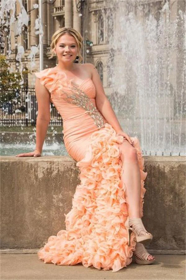 Pink One Shoulder Lace Up Front Split Long Beading Prom Dress K705