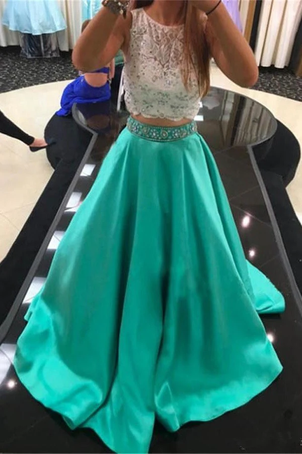 Two Pieces Lace Beading Satin Long Handmade Simple Green Prom Dress K725