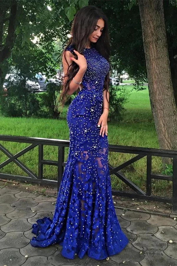 Sparkly Royal Blue Lace Beaded Long Mermaid Backless Prom Dress Evening Dresses K753