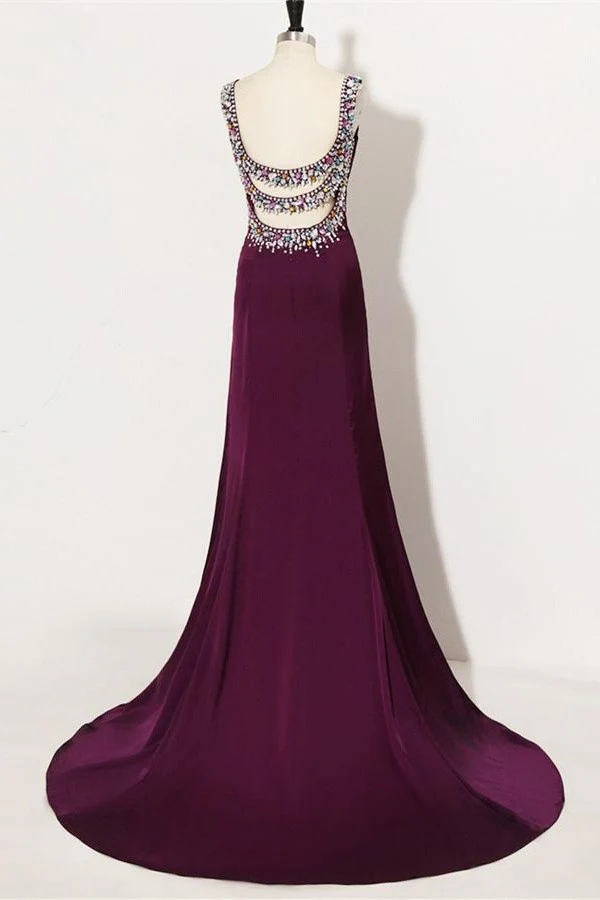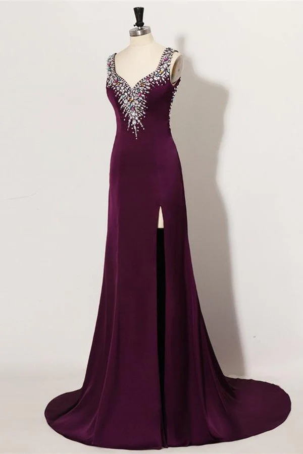 Sweep Train Plum Beaded Long Front Split Mermaid Prom Dress For Teens K740
