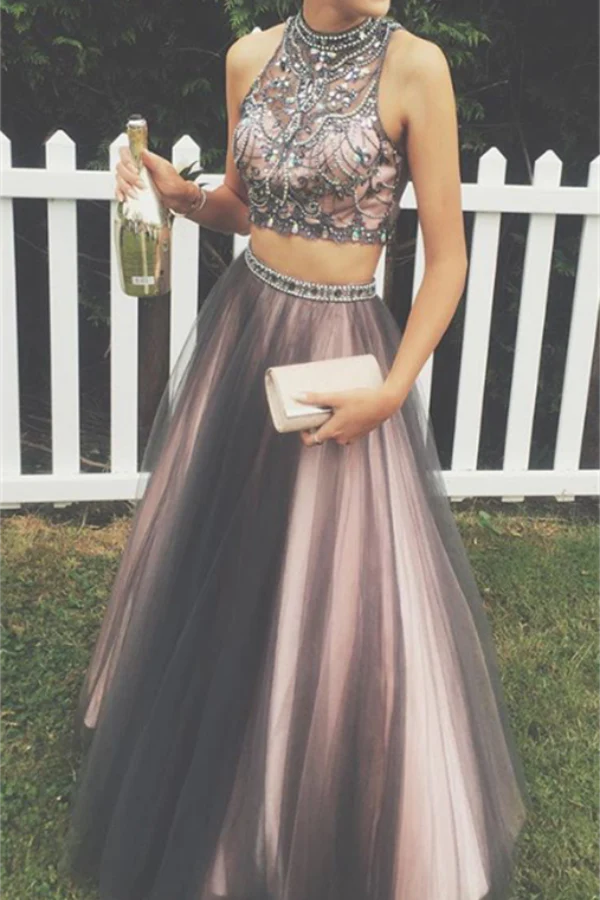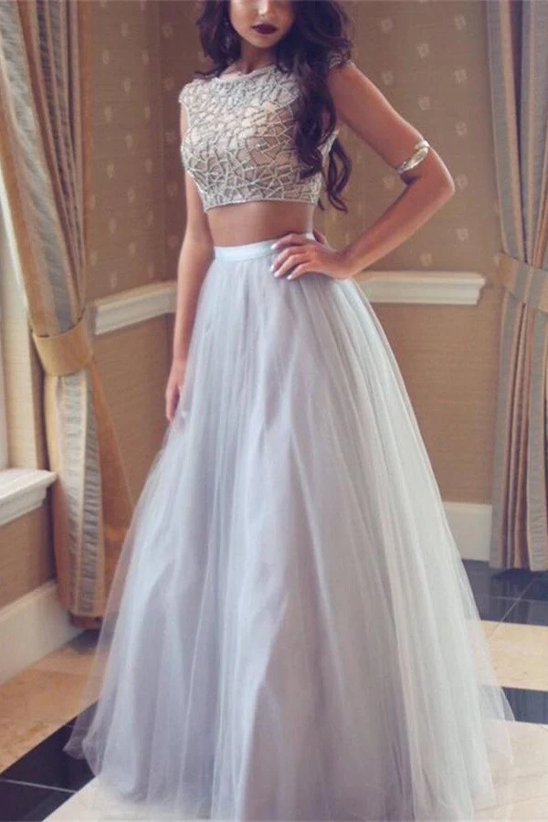 Sparkly Beaded Two Pieces Modest Long Tulle Party Prom Dress K768