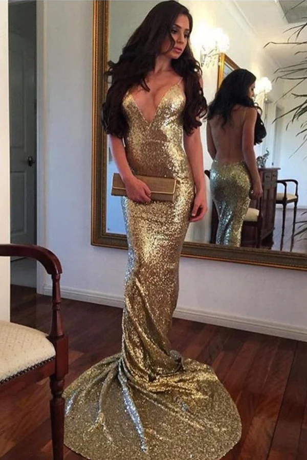Sexy Deep V-neck Mermaid Backless Sparkly Prom Dress For Teens K761