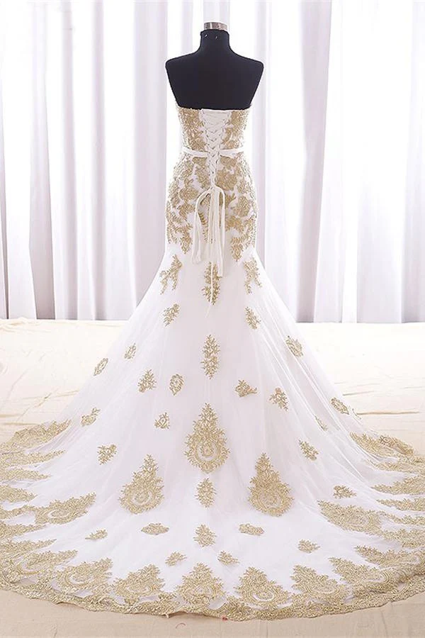 Sweep Train Mermaid Strapless White Long Prom Dress With Gold Lace K709