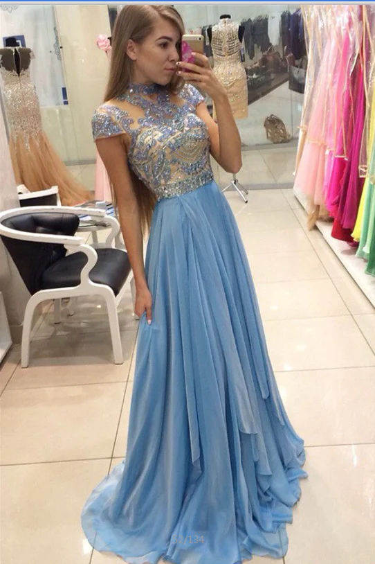 Light Blue Long Beading High Neck Sparkly Cute Prom /Evening Dress OK144