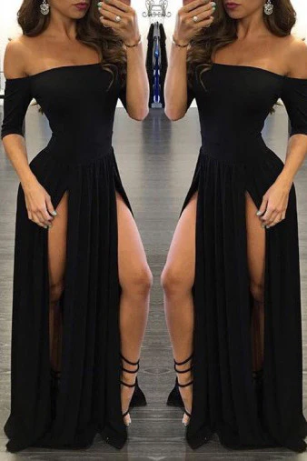 Shevny Sexy Chiffon Off-the-shoulder Half-Sleeve Black Prom Dress With Split OK172