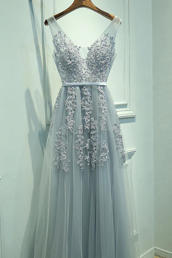 Gray Tulle Long V-neck Evening Dresses, A Line Applique Prom Dresses OKP166