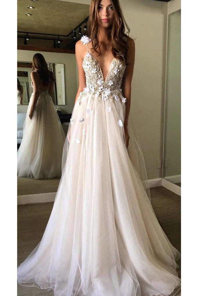 Floral Open Back Deep V-neck Straps Tulle Appliques Prom Dresses Wedding Dress OK180