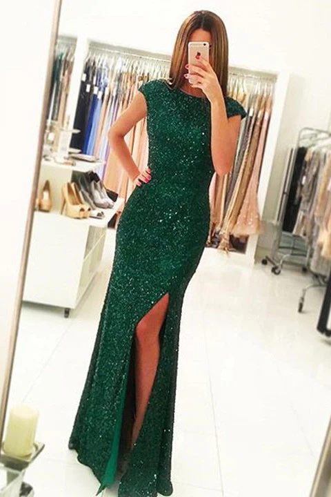 Luxurious Cap Sleeves Dark Green Split-Front Open Back Long Sequin Sexy Mermaid Prom Dresses OK150