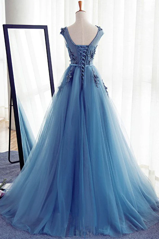 Charming Long Tulle Handmade A Line Blue Prom Gowns,Best Formal Women Dresses OK243