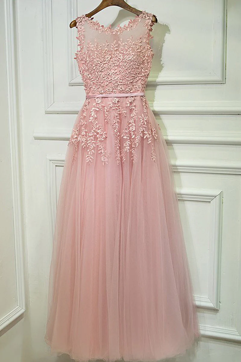 Elegant Appliques Sleeveless Pink Floor-Length A-Line Prom Dress/Evening Gown OK192