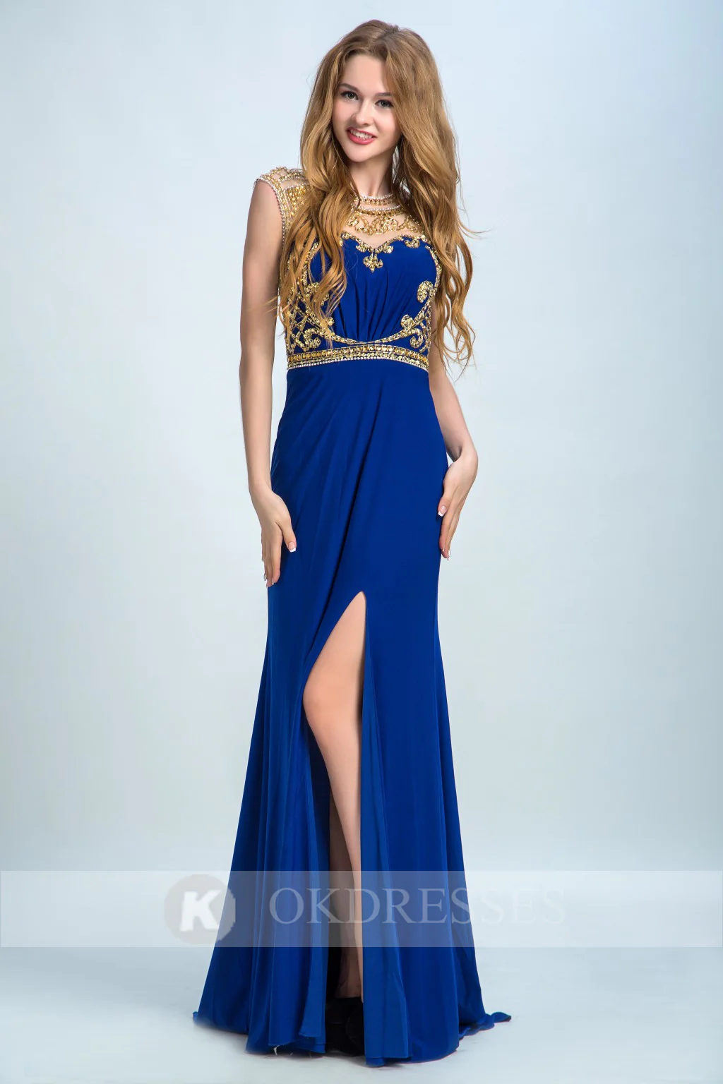 Royal Blue Long Formal Sexy Chiffon Beading Split Prom Evening Dress OK251