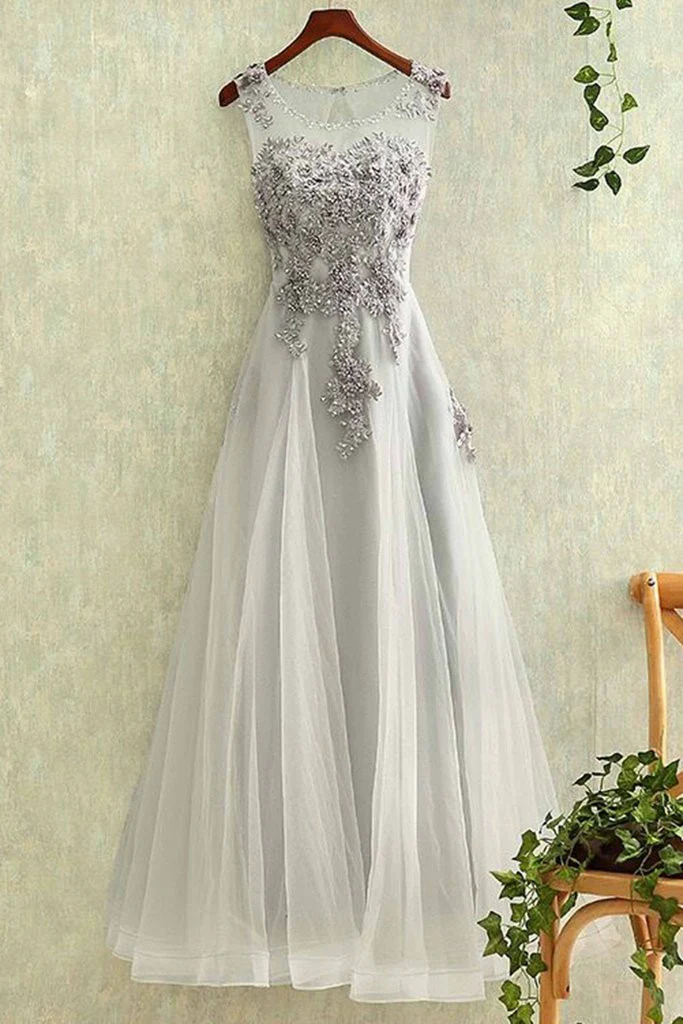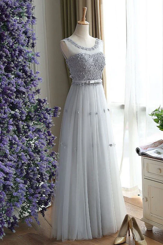Gray tulle round neck a line lace applique see-through long prom/evening dress OK194