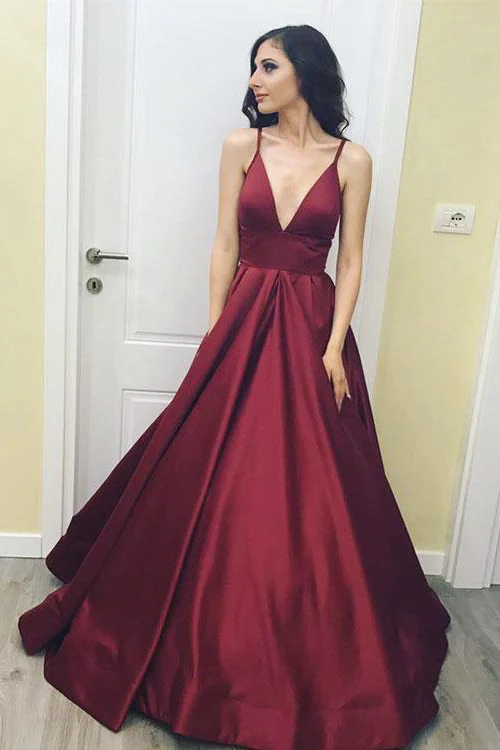 Simple Spaghetti Straps Burgundy V neck Long Prom Dresses,A Line Formal Evening Dress OK401