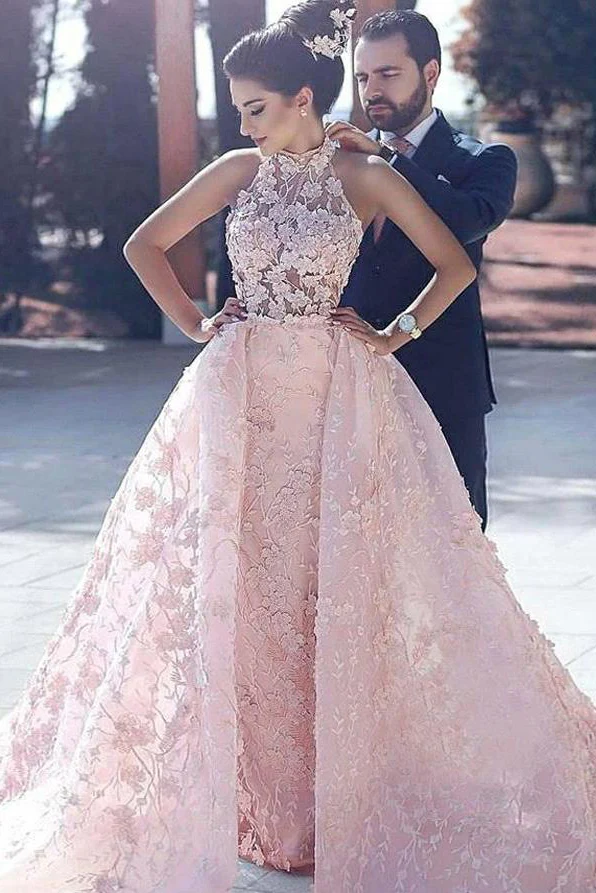 Luxury Pink Lace Wedding Dresses Halter Embroidery Slleveless Prom Dresses Evening Dress OK486