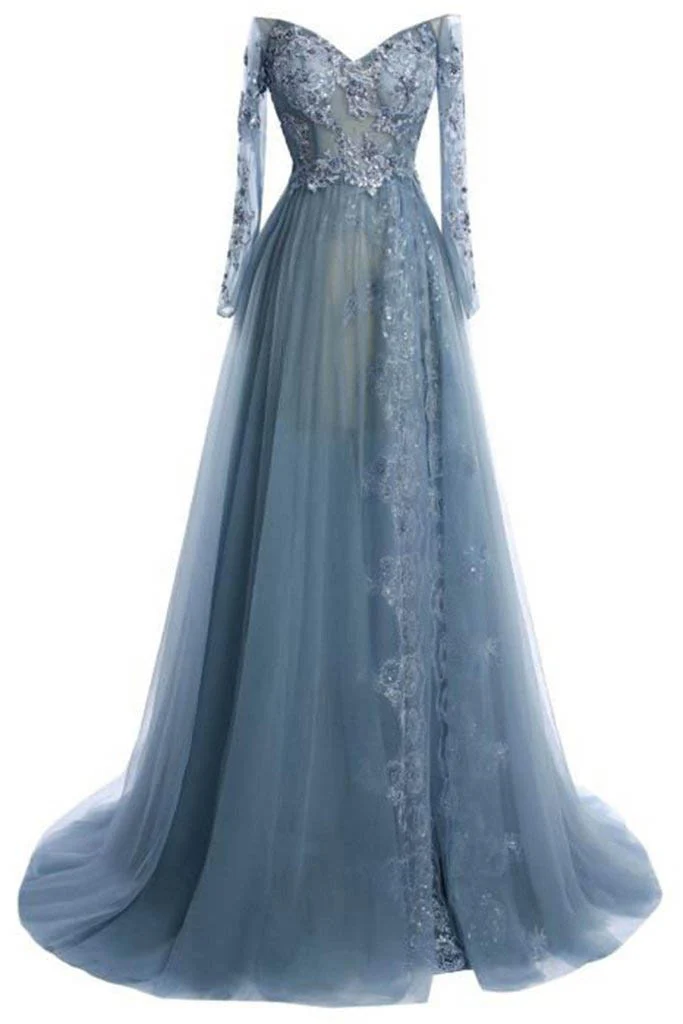 elegant tulle lace long sleeves off-shoulder long prom dresses,evening dress OK196