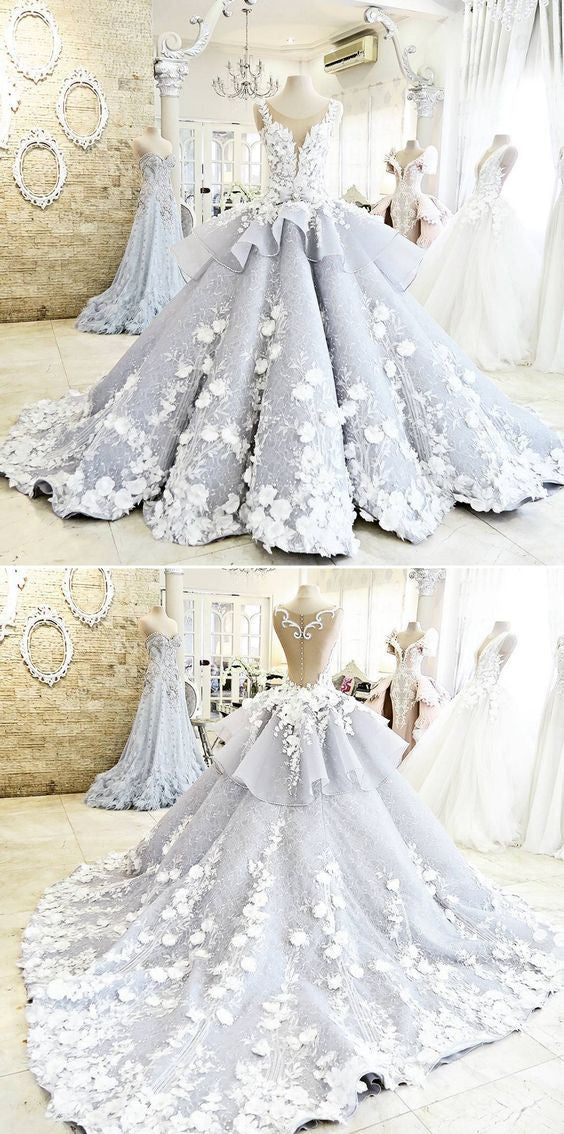 V neck Tulle Lace Long Wedding Dresses,Tulle Ball Gown Prom Dress With Appliques OK402