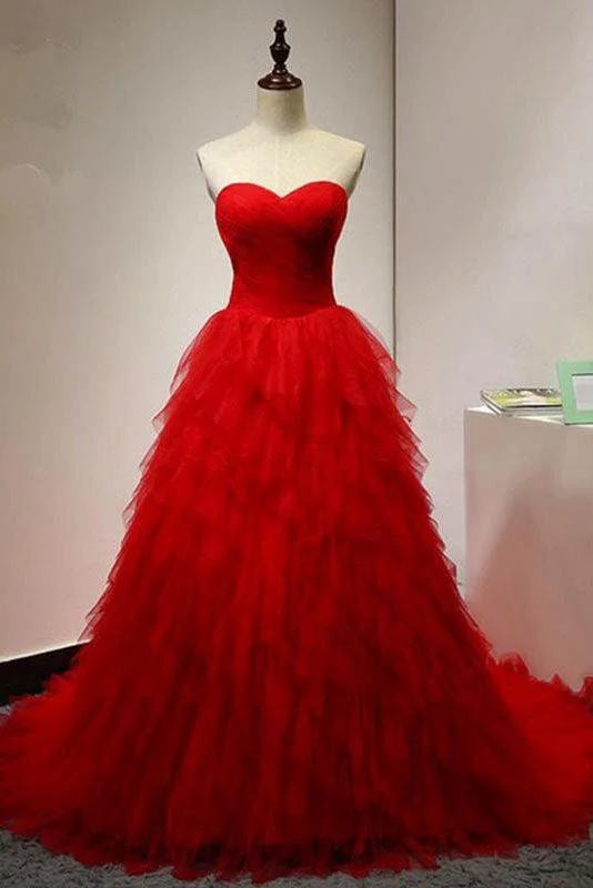 Chic Sweetheart A Line Zipper Back Red Ruffles Cheap Long Prom Dress OKG22