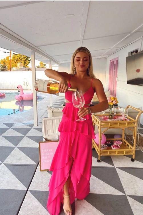 Fashion A-Line V Neck Long Prom Dress Hot Pink Evening Party Gown OK1417