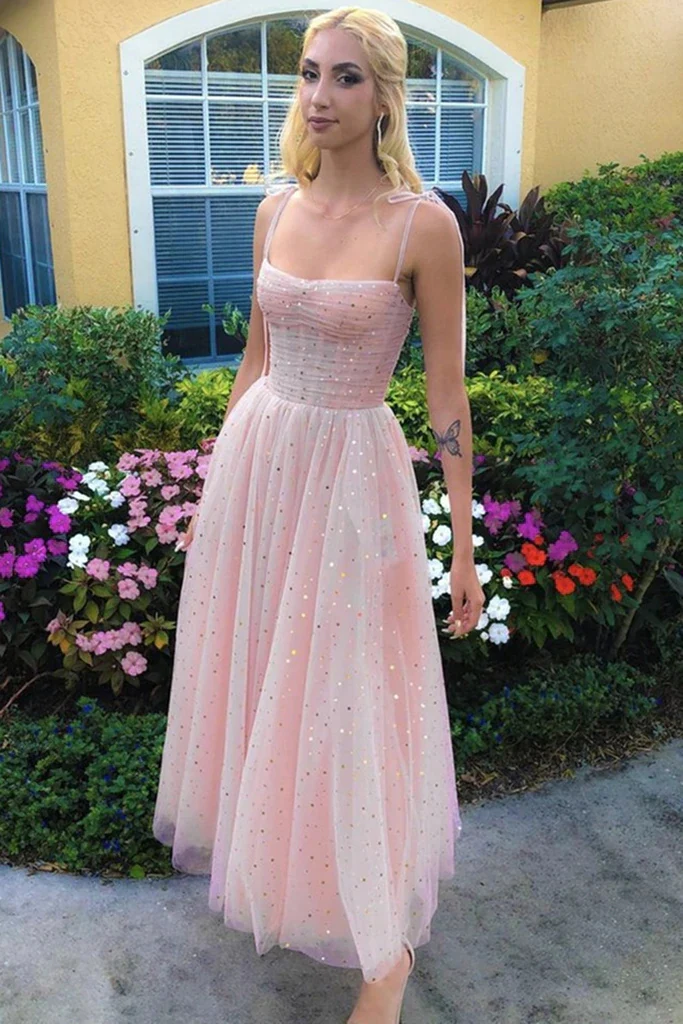 Spaghetti Straps Sequins Pink Tea Length Prom Dresses Shiny Sequins Pink Homecoming Dresses OK1432