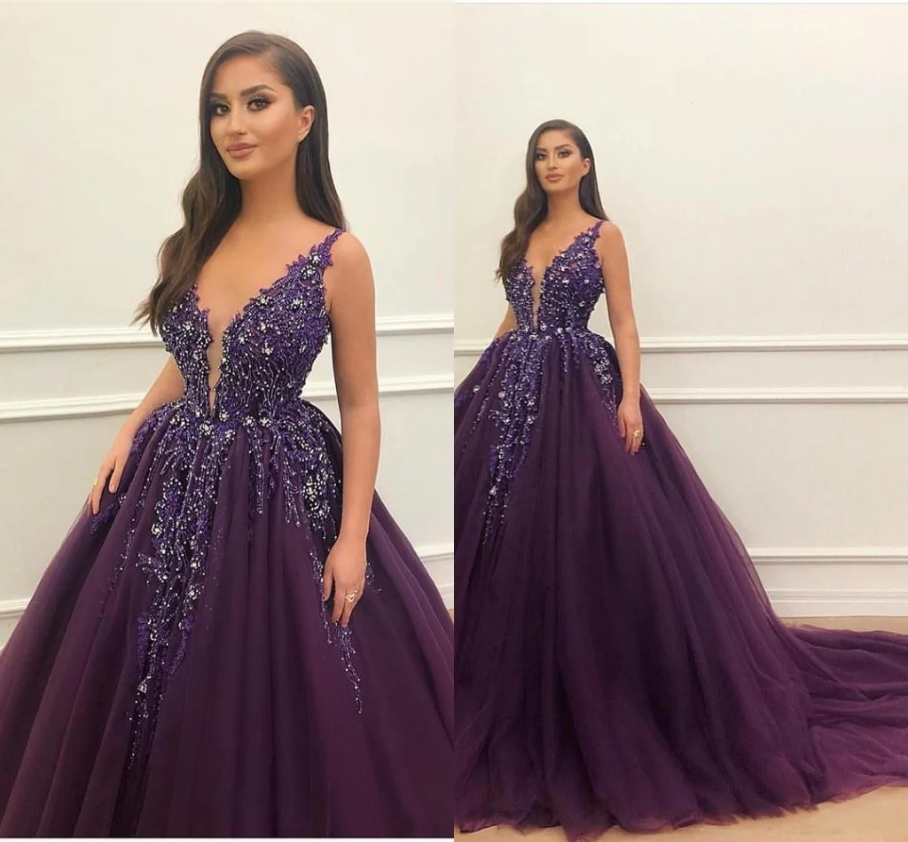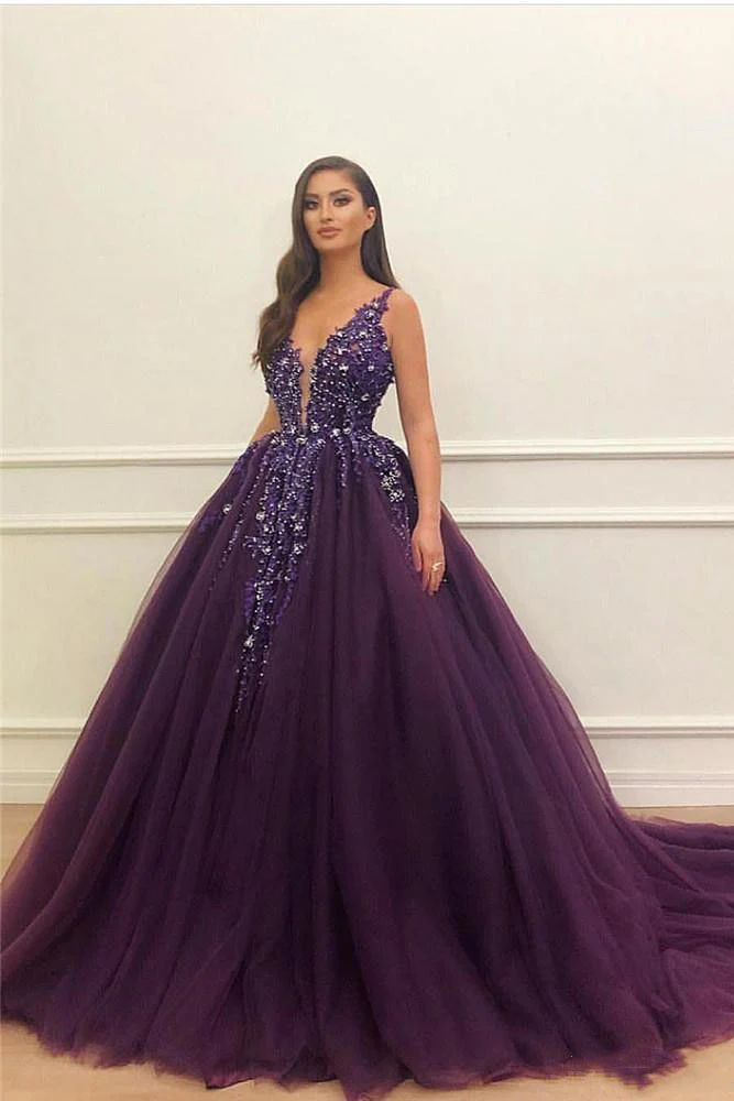 Elegant Purple Tulle V-neck Neckline Floor-length Ball Gown Prom Dress OK1410