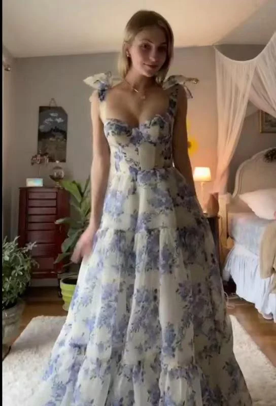 A Line Sweetheart Floral Print Long Prom Dress Formal Evening Dress OK1409