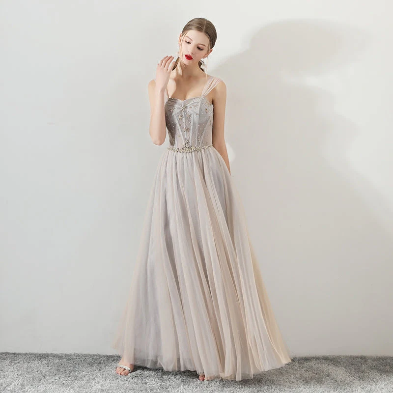 A Line Tulle Long Straps Lace Up Back Beading Prom Dress Evening Dress OKG73
