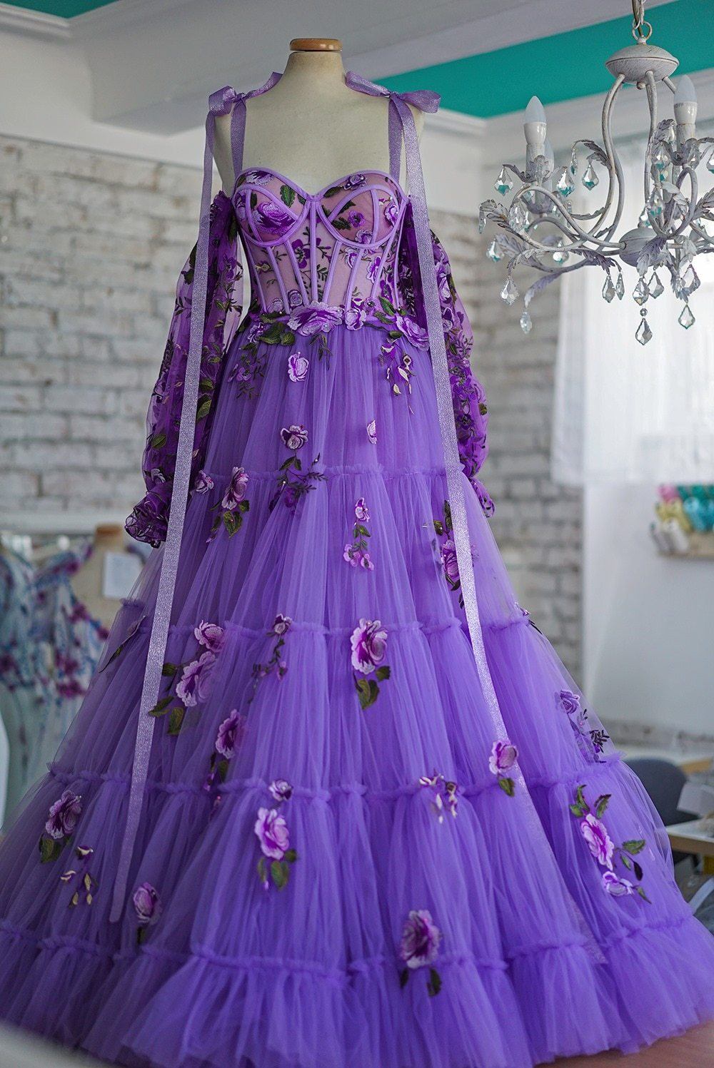 A Line Purple Long Tulle Layered Prom Dress With Flowers Formal Evening Dress OK1404