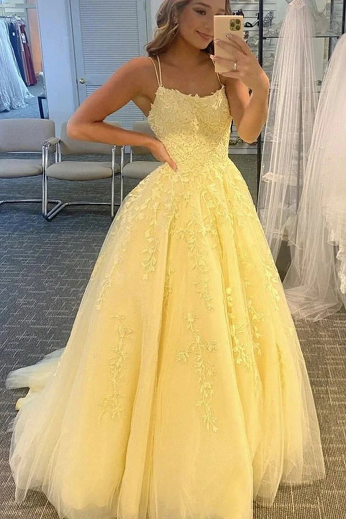 Yellow Lace Appliques Aline Tulle Long Prom Dress Formal Evening Dress OK1416