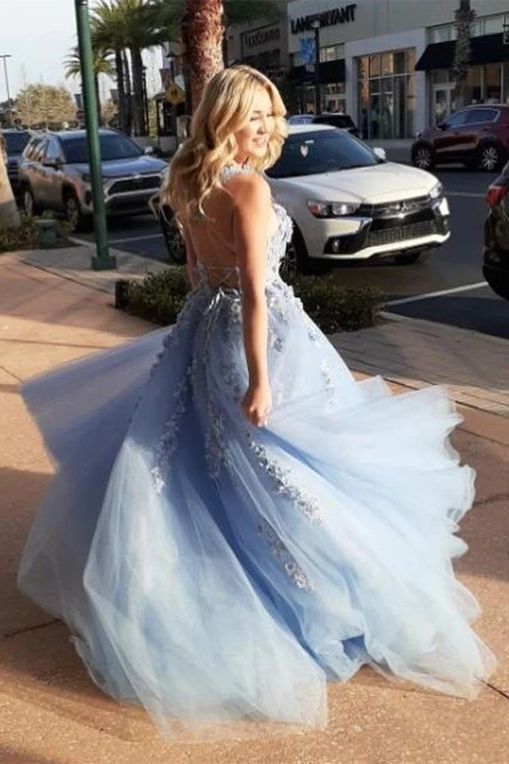 Chic A Line Tulle Light Blue Long Prom Dress with Lace Appliques Evening Gown OK1415