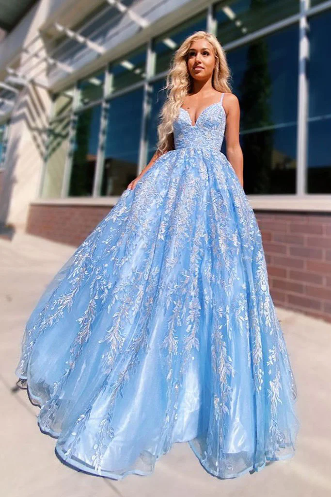 Spaghetti Straps Sky Blue Floral Appliques A Line Long Prom Dress Evening Dress OKR61