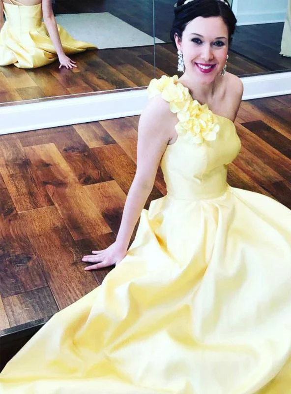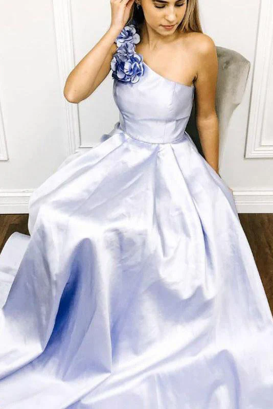A-line One Shoulder Satin Long Prom Dress With Flowers Evening Dress OKR60