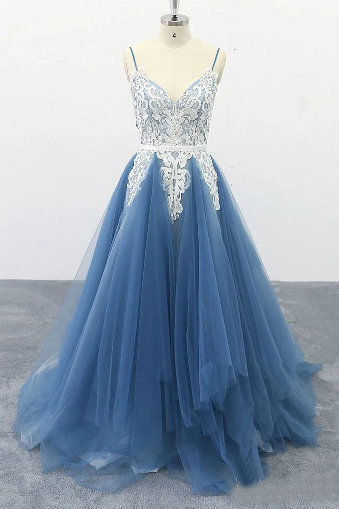 Spaghetti Straps A-line Party Dress Appliques Blue Tulle Prom Dress OKS13