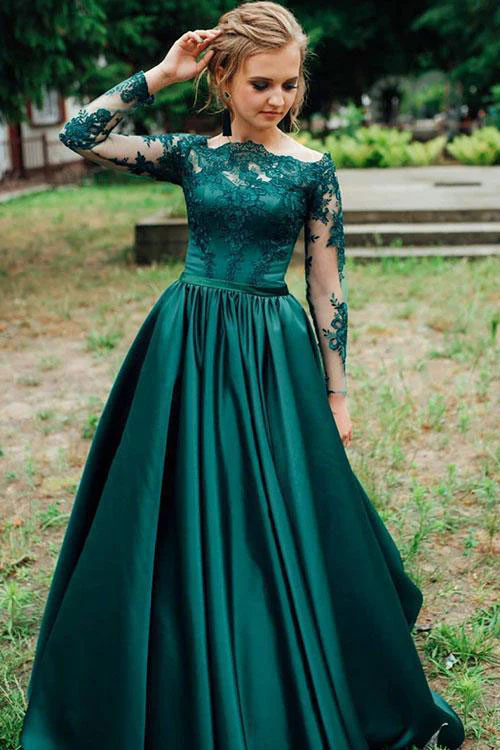 A Line Long Sleeves Dark Green Satin Appliqued Prom Dress Evening Dress OKR46