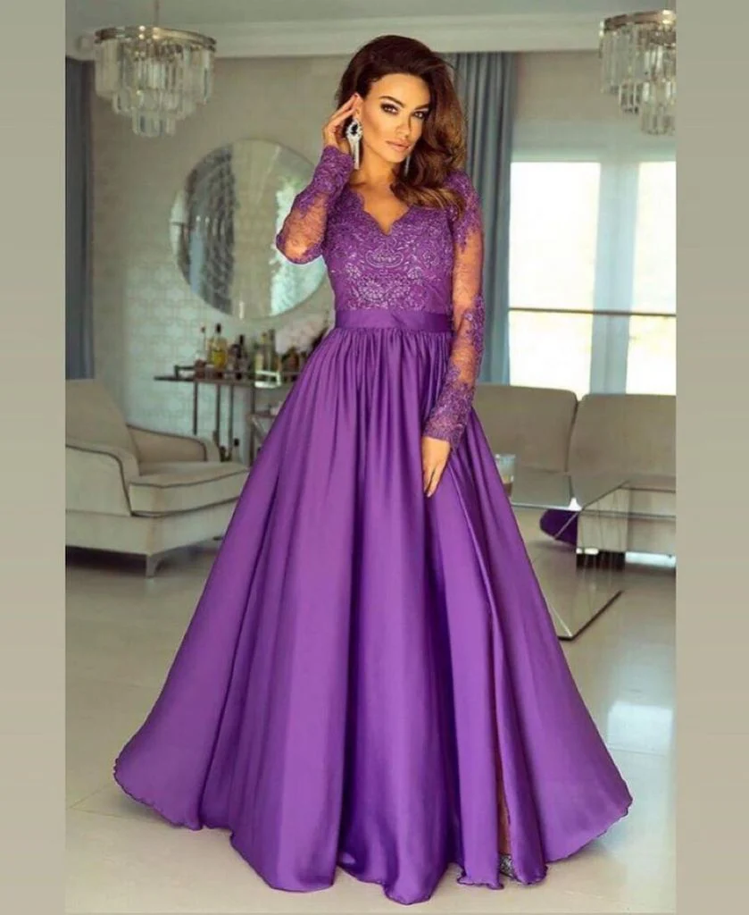 A-line V-neck Long Sleeves Prom Dress Lace Appliques Formal Gown OKR73