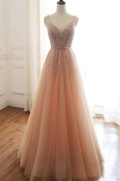 Charming A-line V neck Sparkly Tulle Evening Dress Long Sequins Prom Dress OKS17